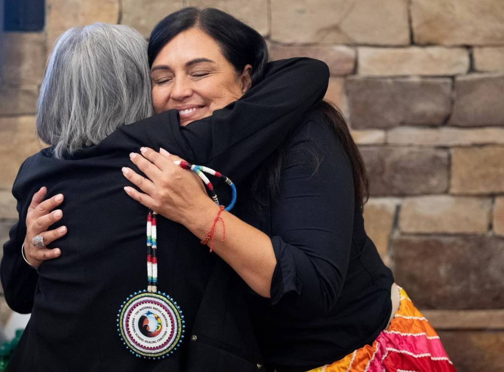 Dr. Ramona Klein, left, who attended the Fort Totten Boarding School in North Dakota, hugs Deborah Parker, the chief executive the National Native American Boarding School Healing Coalition, after presenting her with a beaded NABS medallion on Tuesday, Sept. 16, 2025, at a National Day of Remembrance of boarding school survivors and families hosted by NABS in Washington, D.C. (Credit: Charles Fox for ICT)