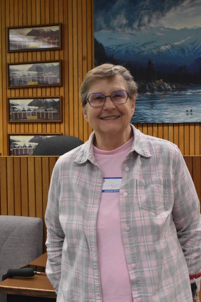 Volunteer Supervisor LaRae Jones paused for a photo at the City Hall Assembly Chambers vote center on Election Day. (Mari Kanagy / Juneau Empire)