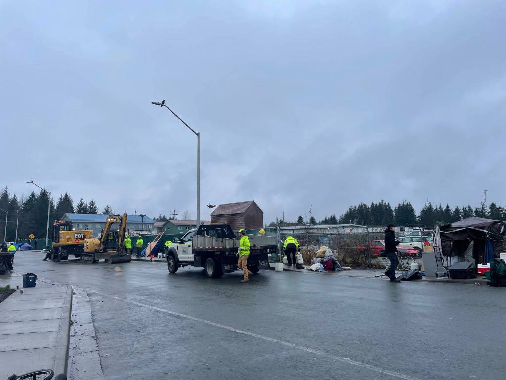 The Juneau Police Department and city employees arrived at Teal Street Friday morning to clear the unhoused encampment. People gathered on the opposite side of their street with their belongings as excavators scooped up tarps, plywood and bedding into dump trucks.
