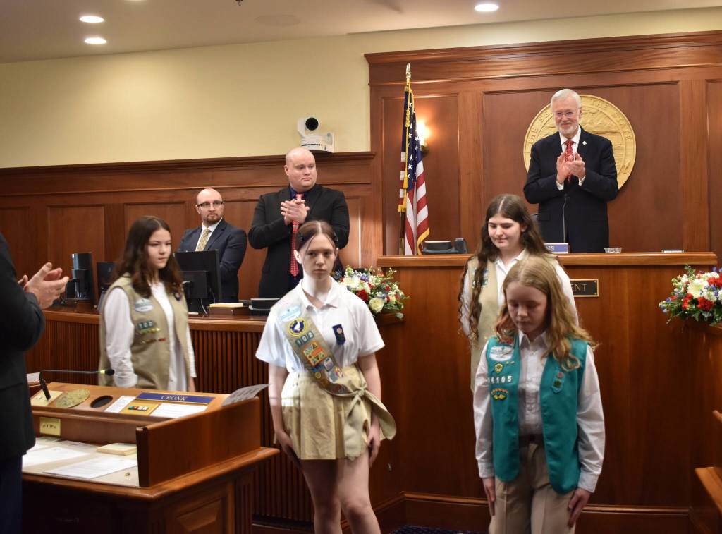 The Girl Scouts of Alaska presents the colors and the Pledge of Allegiance at the Senate Floor Session, opening the second regular session of the state Legislature. (Mari Kanagy/Juneau Empire)