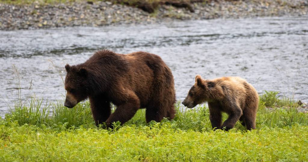 A female brown bear and her cub are pictured near Pack Creek on Admiralty Island on July 19, 2024. (Chloe Anderson for the Juneau Empire)