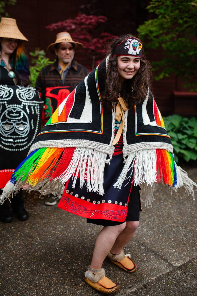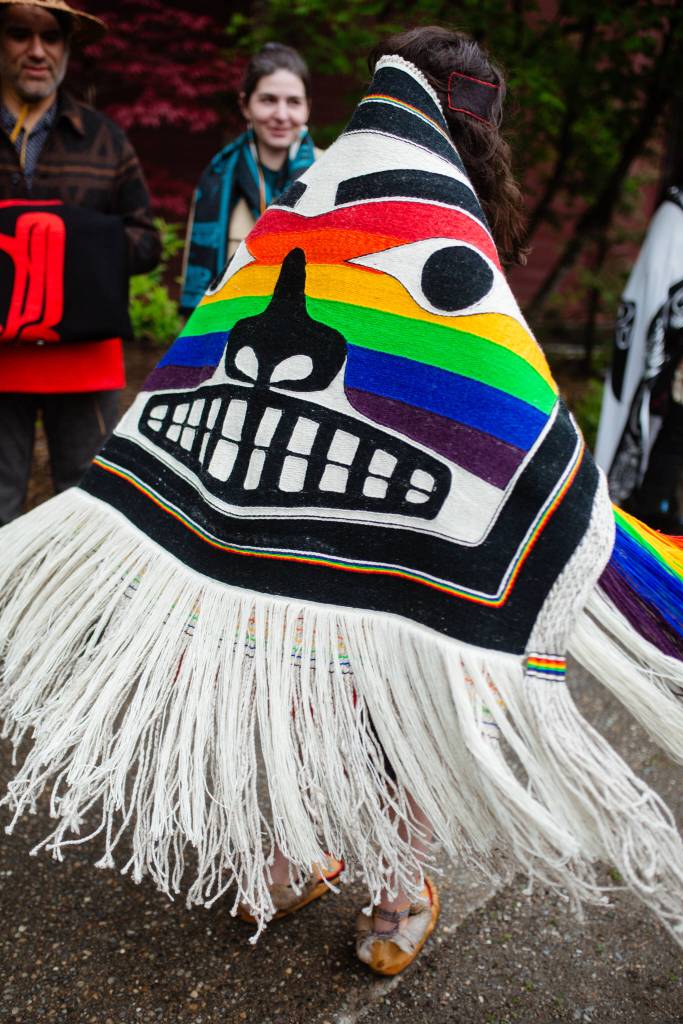 Created by Native and non-Native queer and straight youth after two years of mentorship and collaboration through the community project Weaving Our Pride, one Chilkat and one Ravenstail pride robe will debut at a Coming Out Celebration on March 24.