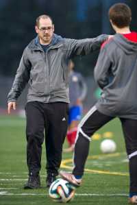 Thunder Mountain High School boys soccer coach Tim Lewis leads his players through a team practice Wednesday at TMHS.