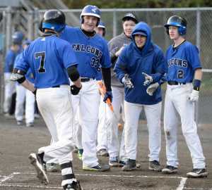 Thunder Mountain players gather around home plate to celebrate Finn Collins' (7) two-run home run in the first inning of the Falcons' 5-8 loss to Ketchikan High School at Norman Walker Field.