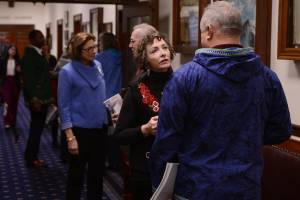 Sen. Shelley Hughes, R-Palmer, speaks to Sen. Mike Shower, R-Wasilla, on Friday, Jan. 26, 2024. (Photo by James Brooks/Alaska Beacon)