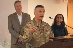 Adjutant General Torrence Saxe, head of the Alaska National Guard, speaks at a Sept. 23, 2022, news conference in Anchorage. Behind him are Gov. Mike Dunleavy and Rep. Mary Peltola. (Photo by Yereth Rosen/Alaska Beacon)