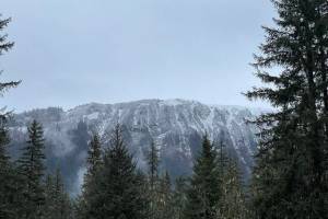 Rain at the National Weather Service Juneau station on Nov. 11 doesn’t exist as snow until hits the upper portion of nearby Thunder Mountain. So far this November has been both warmer and wetter than normal. (Photo by National Weather Service Juneau)