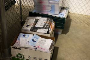 Boxes of envelopes and secrecy sleeves that have had their ballots are removed are stored at the City and Borough of Juneau’s ballot processing center on Tuesday, Oct. 3, the date of this year’s municipal election. Because it was a by-mail election, ballots postmarked by that date are still being tallied, with the official results scheduled to be certified Oct. 17. (Clarise Larson / Juneau Empire File)