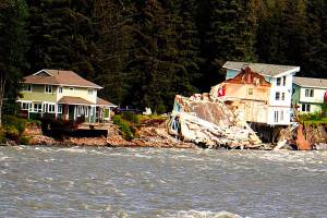 A home hangs over the edge of an eroded riverbank after part of the neighboring house fell into the Mendenhall River during the record flooding of Suicide Basin on Aug. 5. The rest of the second home was later demolished. (Mark Sabbatini / Juneau Empire File)