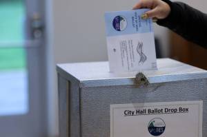 A ballot is placed in a drop box during the City and Borough of Juneau 2022 municipal election. (Ben Hohenstatt / Juneau Empire File)