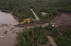 The deadly landslide that crashed through the outskirts of Wrangell on the night of Nov. 20, 2023, is seen from the air on the following day. The landslide killed six people and blocked a major road, the Zimovia Highway. (Photo provided by Alaska Department of Transportation and Public Facilities)
