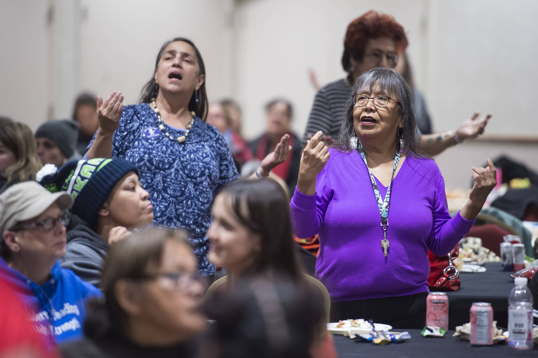 Nancy Keen, left, and Leona Santiago, right, pay tribute to the Woosh.ji.een Dance Group as they perform during a Celebrate Survivors gathering sponsored by Central Council Tlingit and Haida Indian Tribes of Alaska and AWARE in the Elizabeth Peratrovich Hall on Tuesday, Oct. 23, 2018. October is Domestic Violence Awareness Month. (Michael Penn | Juneau Empire)