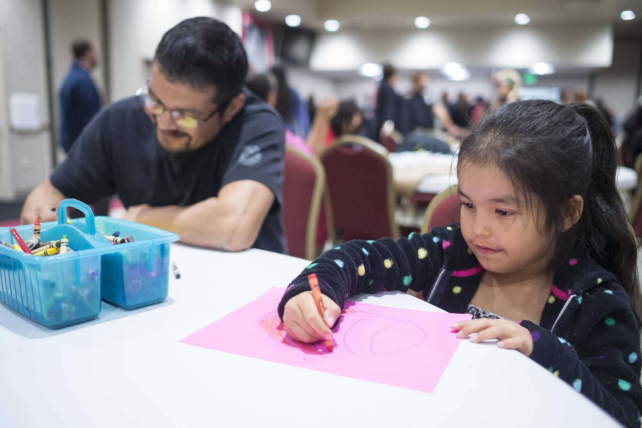 Carl Stepetin draws with his daughter, Pauline, 6, during a Celebrate Survivors gathering sponsored by Central Council Tlingit and Haida Indian Tribes of Alaska and AWARE in the Elizabeth Peratrovich Hall on Tuesday, Oct. 23, 2018. October is Domestic Violence Awareness Month. (Michael Penn | Juneau Empire)