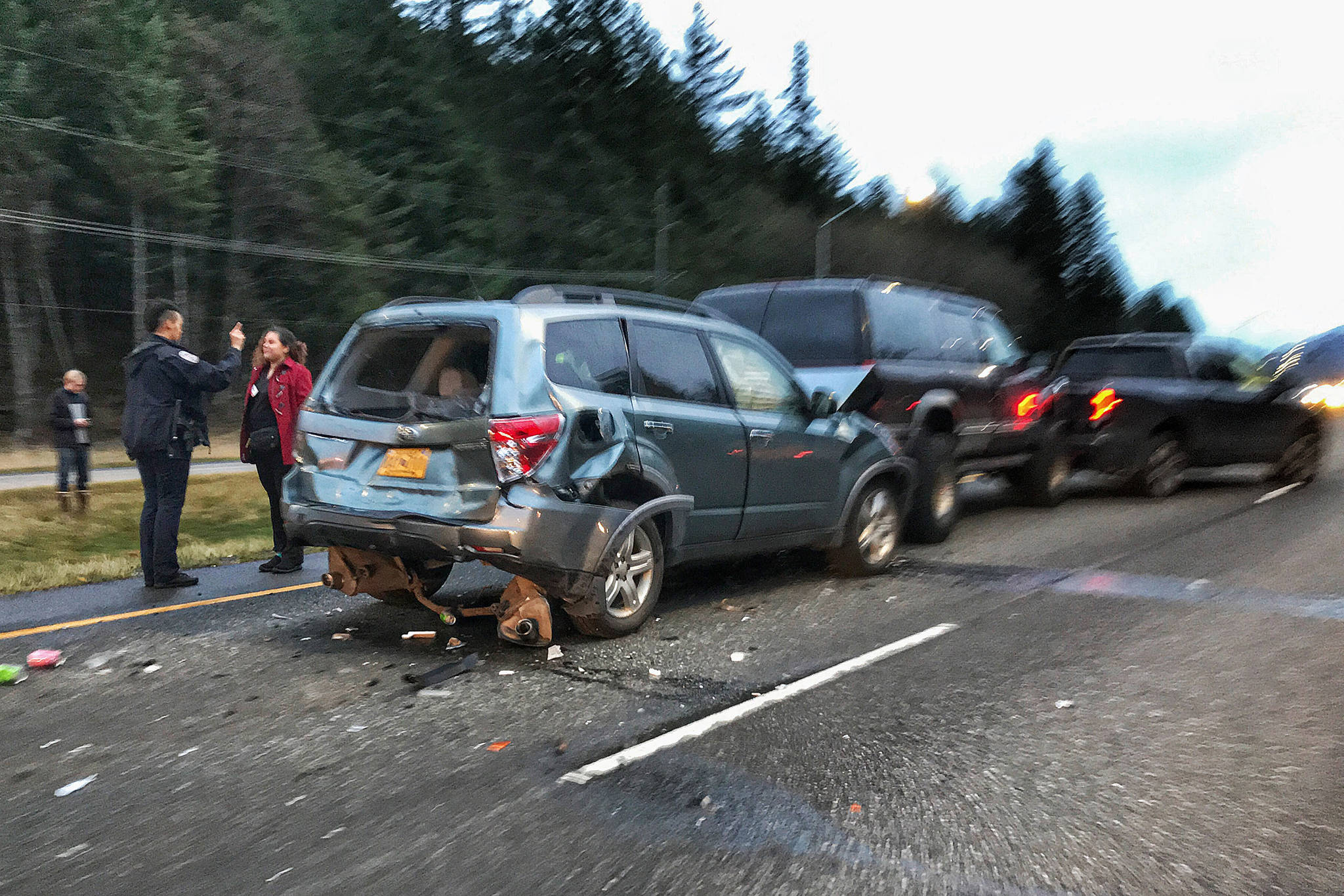 A Juneau Police Department Officer gives a woman driver a sobriety test after a four-vehicle accident on the inbound land of Egan Drive between Glacier Highway and Mendenhall Loop Road on Wednesday, Oct. 24, 2018. (Michael Penn | Juneau Empire)