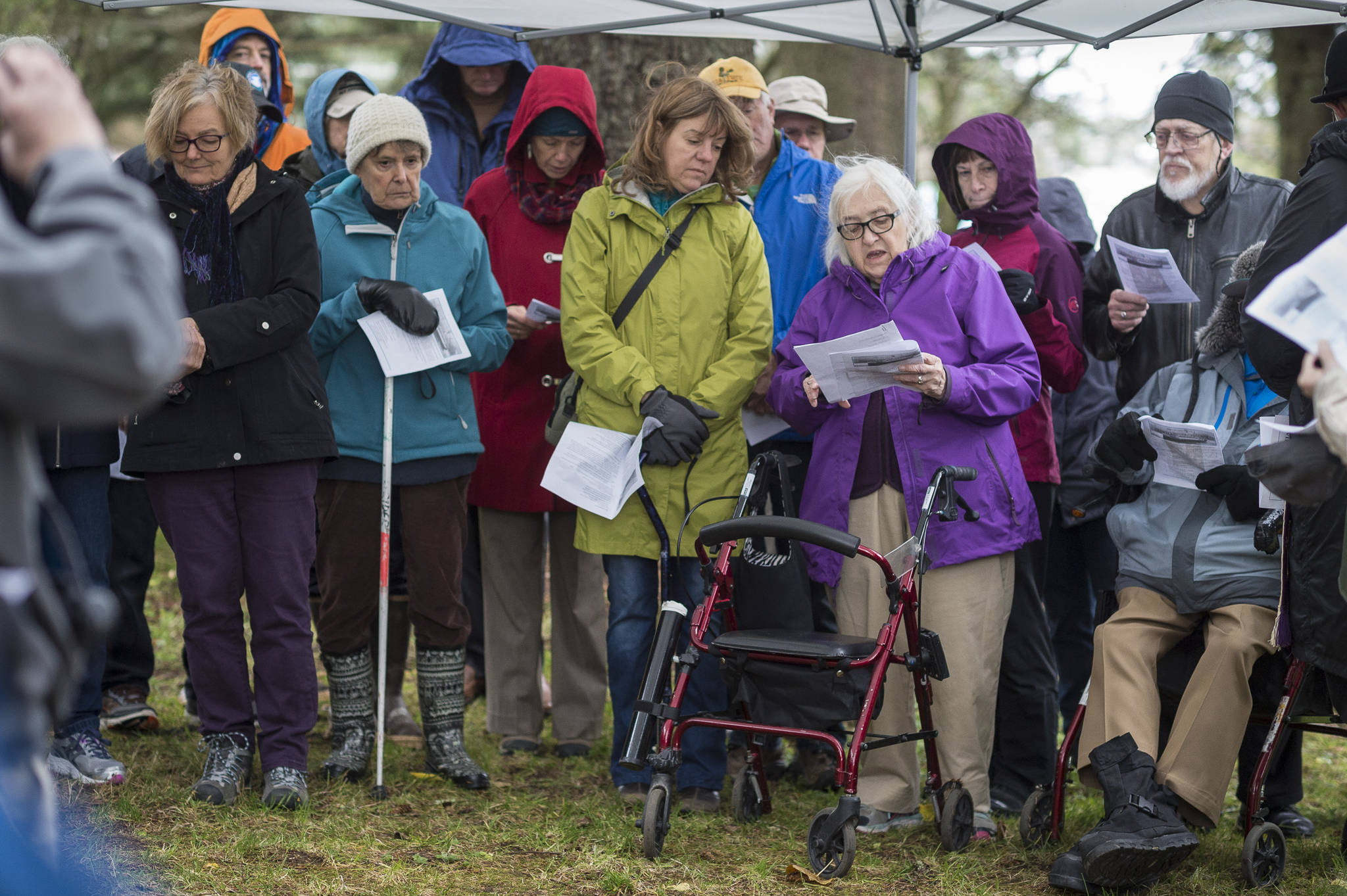 Mary Lou Spartz reads the names of victims buried at the Evergreen Cemetery during a memorial service on Thursday, Oct. 25, 2018, on the 100th anniversary of the sinking of the Princess Sophia. The service takes place at the gravesite of Walter Harper and his wife, Frances Wells. (Michael Penn | Juneau Empire)