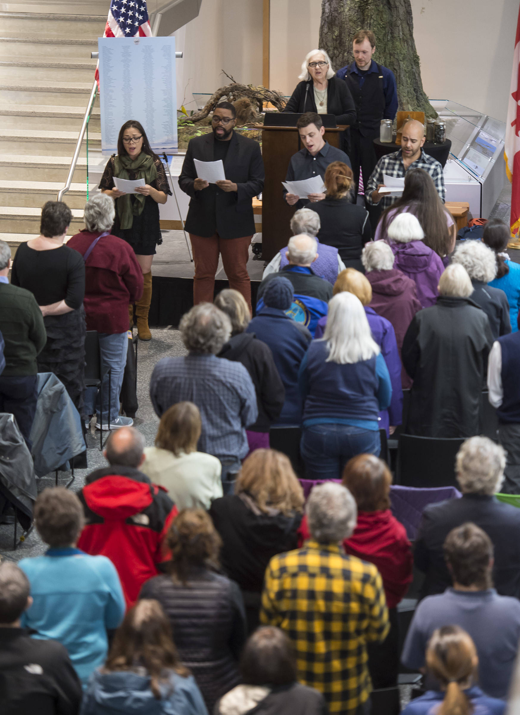 Members of the Princess Sophia Opera sing the national anthems of the United States and Canada during a Centennial Commemoration Ceremony at the Father Andrew P. Kashevaroff Building on Thursday, Oct. 25, 2018, on the 100th anniversary of the sinking of the S.S. Princess Sophia. (Michael Penn | Juneau Empire)