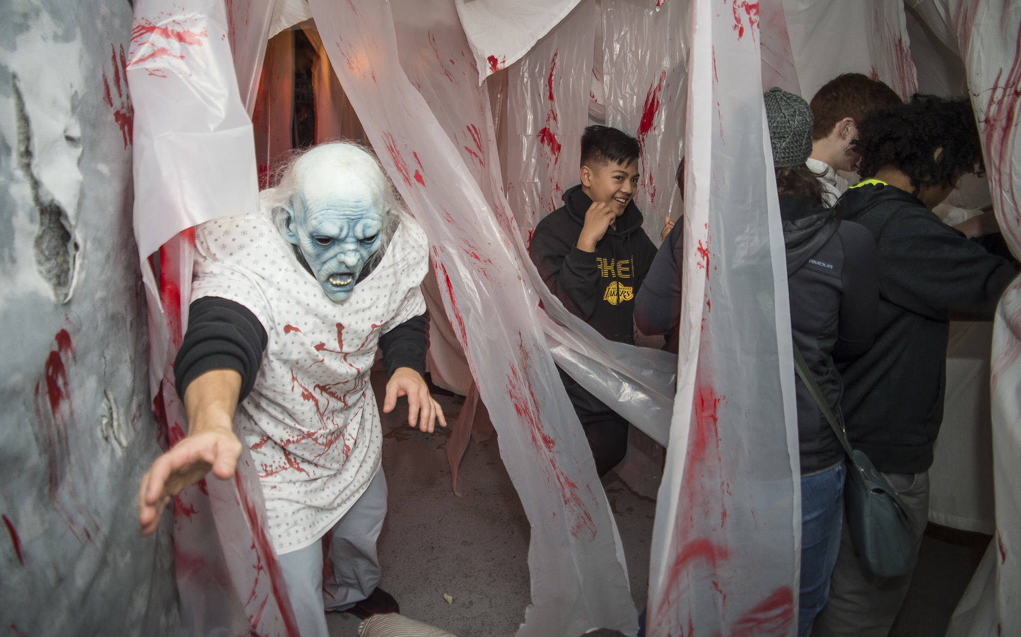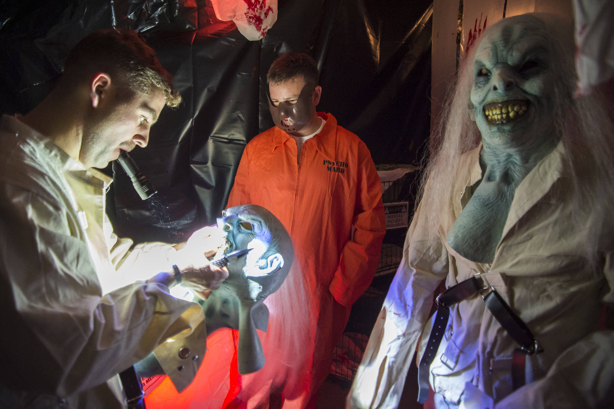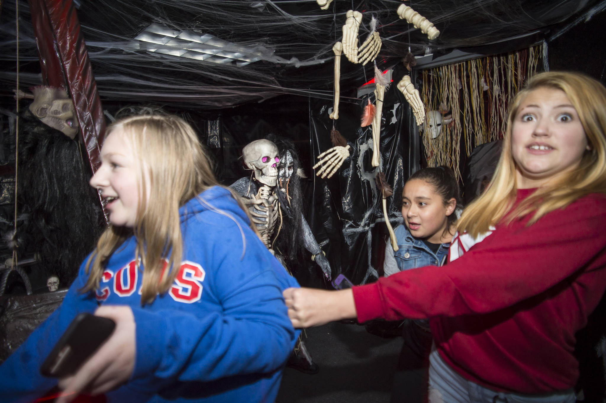 Juneau residents react to scares and chills as they make their way through the Haunted Station at the U.S. Coast Guard’s Station Juneau on Friday, Oct. 26, 2018. Station personnel pay for all the decoration themselves and take three weeks to ready the station. Entry is non perishable food items for the Southeast Alaska Food Bank. (Michael Penn | Juneau Empire)