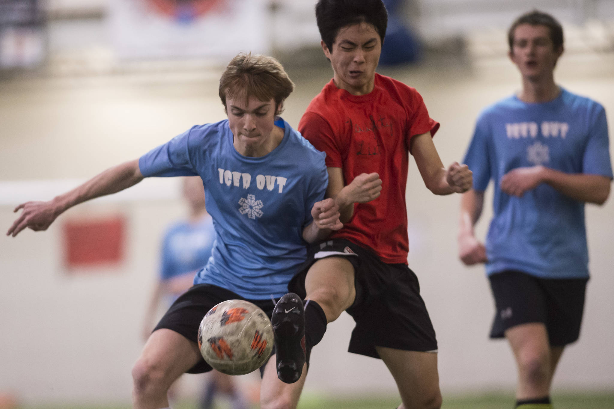 Iced Out’s Kanon Goetz, left, battles Naughty List’s Chaehun Yi in the finals of the high school division at the annual Holiday Cup Soccer Tournament at the Wells Fargo Dimond Park Field House on Monday, Dec. 31, 2018. Iced Out won 8-2. (Michael Penn | Juneau Empire)
