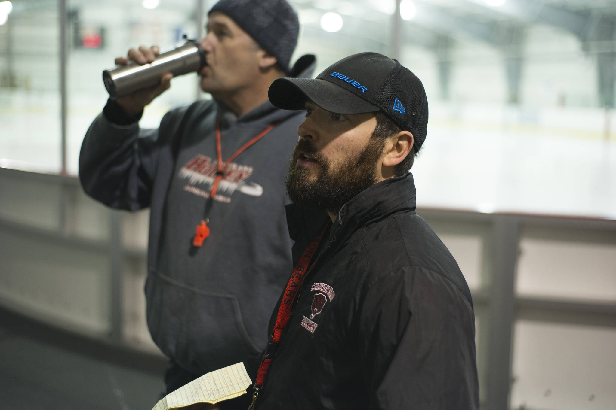 Juneau-Douglas High School’s Joey Meier, left, and Dalton Hoy, right, listen to coach Luke Adams during the team’s first practice of the season on Wednesday morning at Treadwell Arena. The team’s first home games are Nov. 16-17 against Palmer. (Nolin Ainsworth | Juneau Empire)
