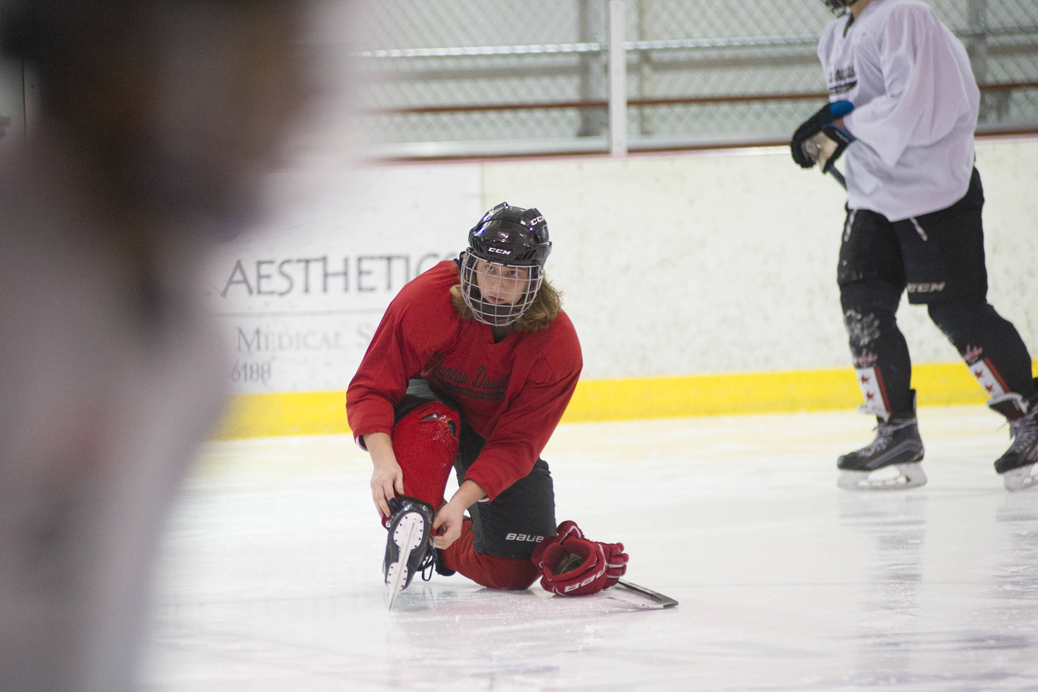 Juneau-Douglas High School senior Logan Ginter adjusts his skates during warmups on Wednesday morning at Treadwell Arena. (Nolin Ainsworth | Juneau Empire)
