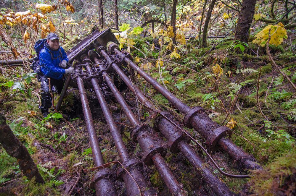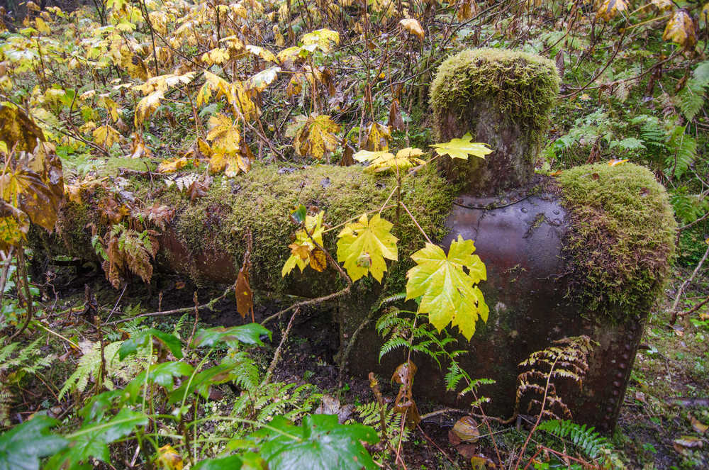 Using a GPS application on my phone called Back Country Navigator, several old pictures, and a map from 1914, I recently visited the site with other members of the hiking group Juneau’s Hidden History to locate the center of town. Greg Taylor, Gerald Hewes and I began to look around the area. Four-inch-thick moss covered everything. Devils Club and alders were also thick on the hillside. After a few minutes of searching the area, it appeared that there were no manmade objects around us. I began to get worried I had messed up on the GPS data, or flipped the image of the town somehow. As my doubt took hold, Greg yelled out that he had found something. It was a 55-gallon barrel that had been converted into a woodstove. Jackpot! Nearby we removed sections of moss from the ground; dishes, pots and pans were uncovered. The foot of a stamp, a wash basin, and then a large boiler were found. With the excitement growing, the group split up and started to grid search the area. Using the old photos of town we began to locate where the buildings once stood. The Machine Shop/Lumber Mill and Blacksmith were located, and the ghost town of Amalga started to take shape. Large pieces of equipment covered in several inches of moss went unnoticed for some time as we walked around them. The remains of Superintendent Thane’s house were located, along with a Risdon 10-Stamp Mill that was not removed from the mine upon its closing in 1915. The moss was carefully removed from the larger pieces of equipment and building ruins. Photos and video were taken during the process in order to show the before and after taking place. Several GPS coordinates were marked on our maps to show where the buildings once stood. The town of Amalga could be seen once more. We spent several hours locating some of the caved adits in the area. Many still had rail tracks running right to them from the town site. After a long day of hiking off trail, up hillsides, and crossing several streams we headed to the Eagle Glacier cabin that we rented for the night. It took me forever to fall asleep. What an awesome day!