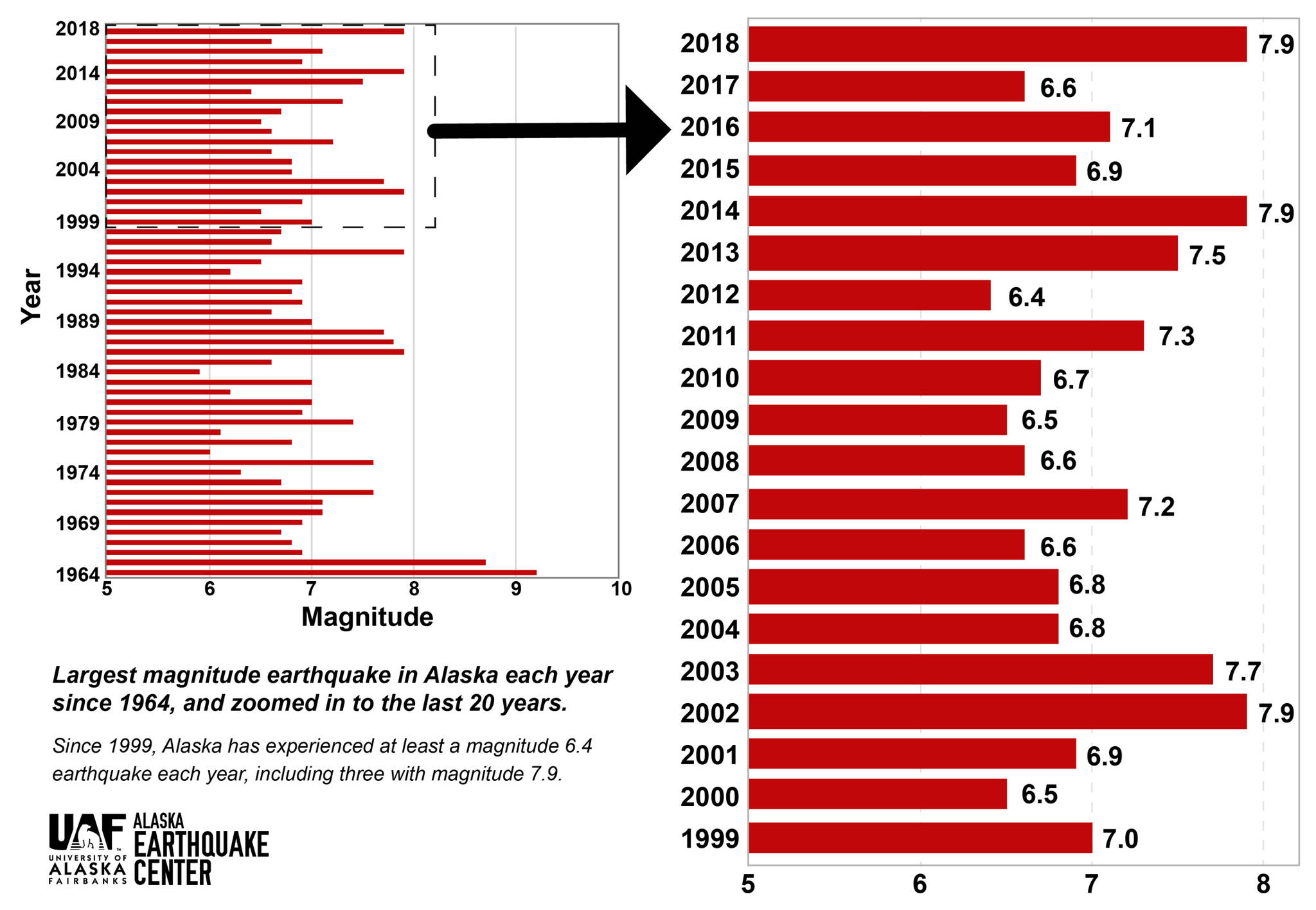 There’s no argument, a 7.9 is impressive. Even in Alaska, we’ve felt only three in the last 20 years. Each of them was 15 times more powerful than the 7.1 Iniskin earthquake that in 2016 snapped gas lines in Kenai and burned down four houses.