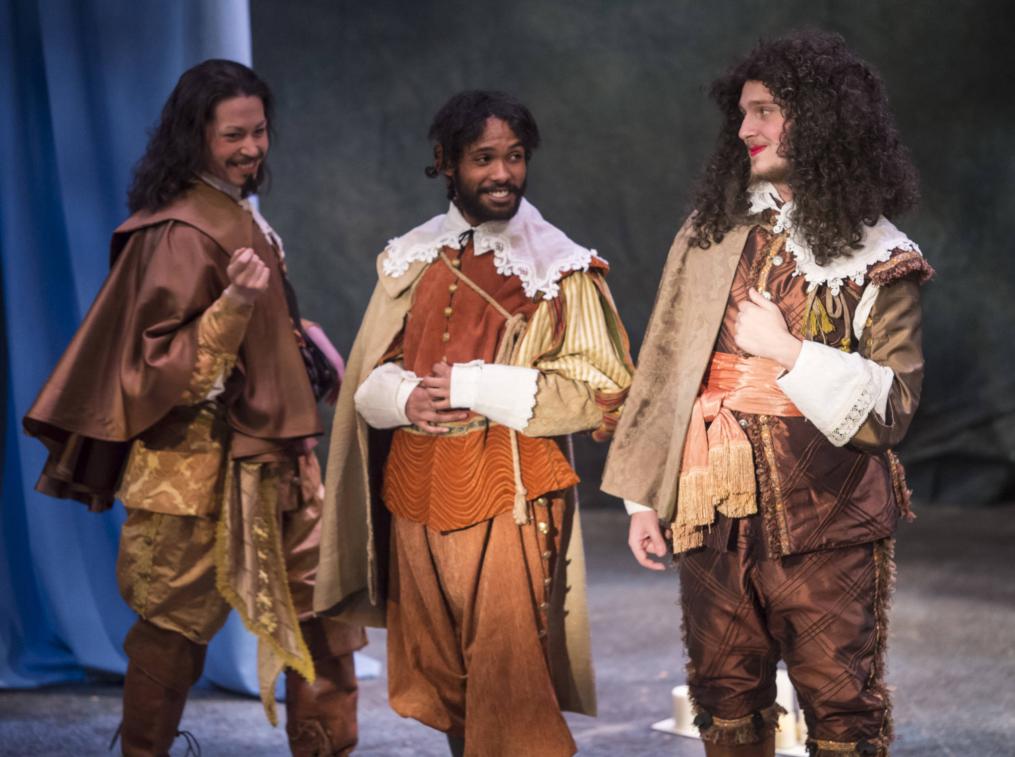 The costuming, by costume designer Peggy McKowen, also deserves high praise. We’re talking silk pantaloons, lace cravats, feathered hats, powdered wigs…the whole Louis XIV thing, several different ensembles for each member of the ensemble.