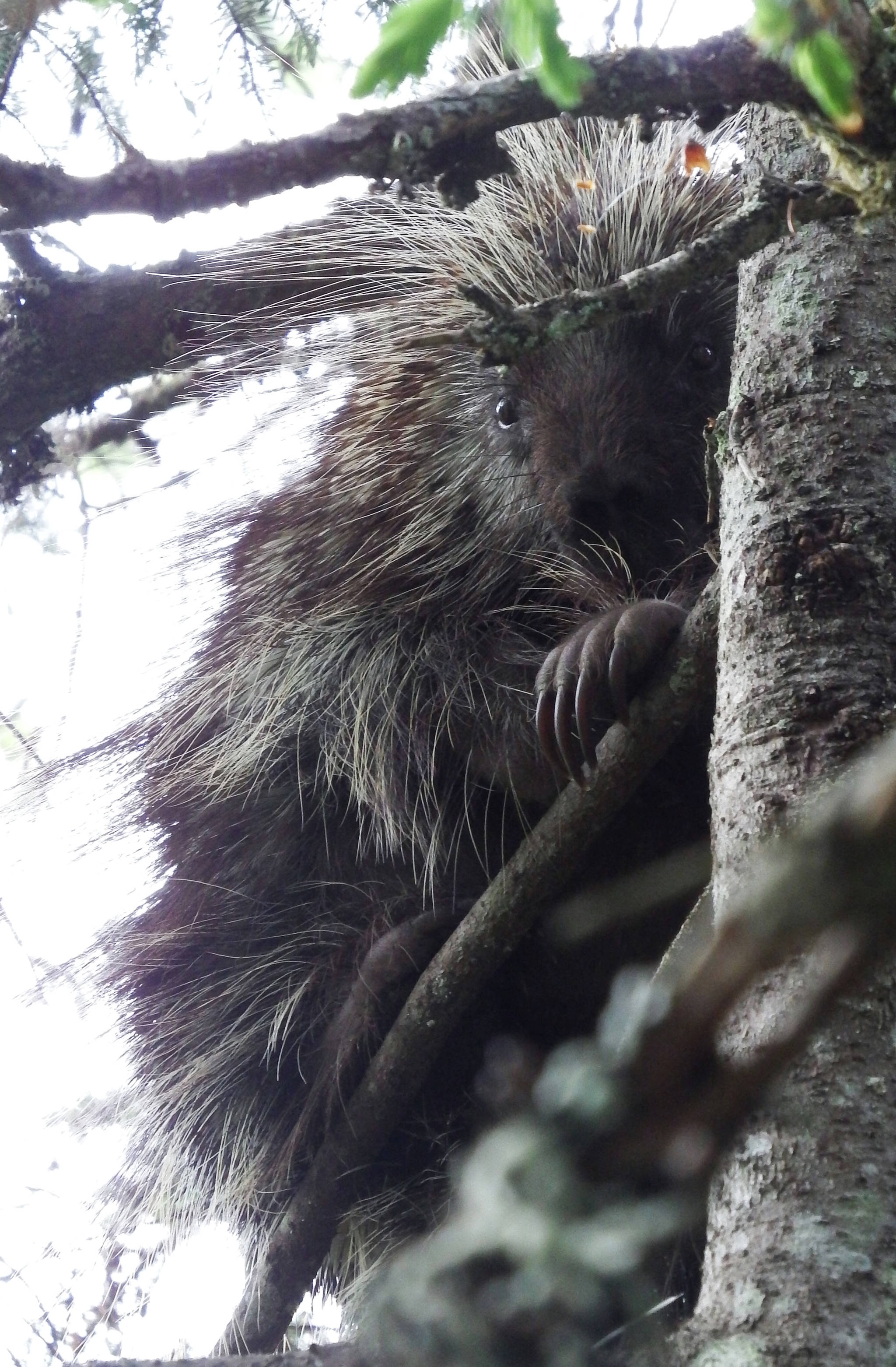 A porcupine peers down from its perch near the Mendenhall Campground in early June. (Photo by Linda Shaw)