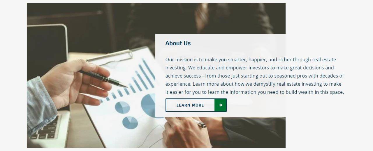 “Our mission is to make you smarter, happier, and richer through real estate investing. We educate and empower investors to make great decisions and achieve success – from those just starting out to seasoned pros with decades of experience.”