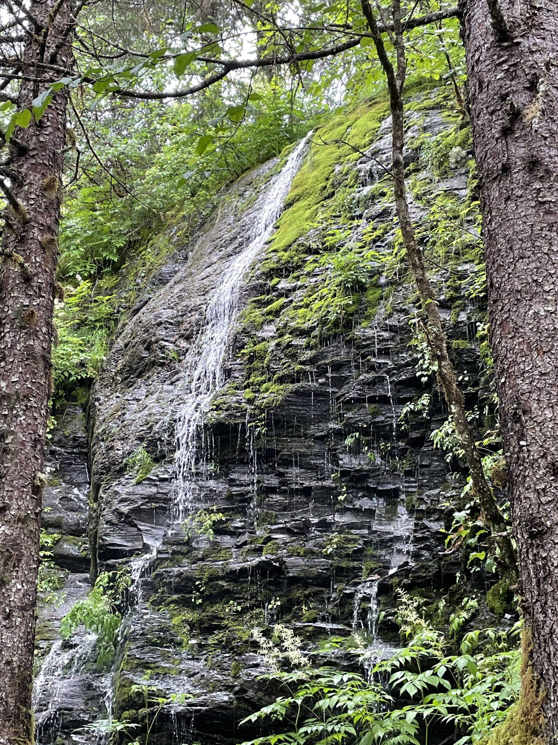 One hundred years later that same waterfall trickles sporadically down the steep mossy slope adjacent to the Trail of Time. It no longer drains the glacier. When heavy rain falls, the rocky slope faucets small chutes of water. Mostly it just seeps. It is located northwest of the CCC Shelter. Several hundred feet south, the U.S. Forest Service has posted an interpretive sign at the site where the presidential party posed for their photograph. It is almost hidden in the brush on a short spur of the historic Trail of Time.