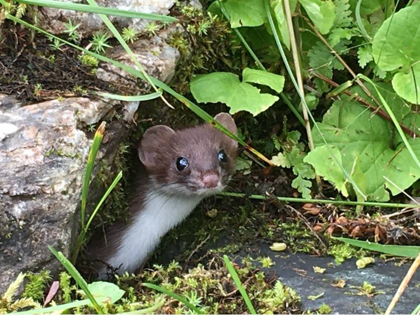 On a lovely, sunny but cool and windy, day in mid-October, a little group of friends strolled up the road at Eaglecrest to go off onto the upper ski loop. Darting in and out of the angular rocks that line the road toward the Black Bear lift was a small white critter that disappeared almost as soon as it showed its head. So it took us a little time to ascertain who it was: of course, a short-tailed weasel or ermine (called a stoat in Europe). It then gave us many chances to see it as it explored both sides of the road, around the turn and past the Kimball memorial bench, popping up its head every so often to look around (and perhaps to check on us). The weasel was presumably hunting for something edible, such as a vole or shrew, but we saw no evidence of success.