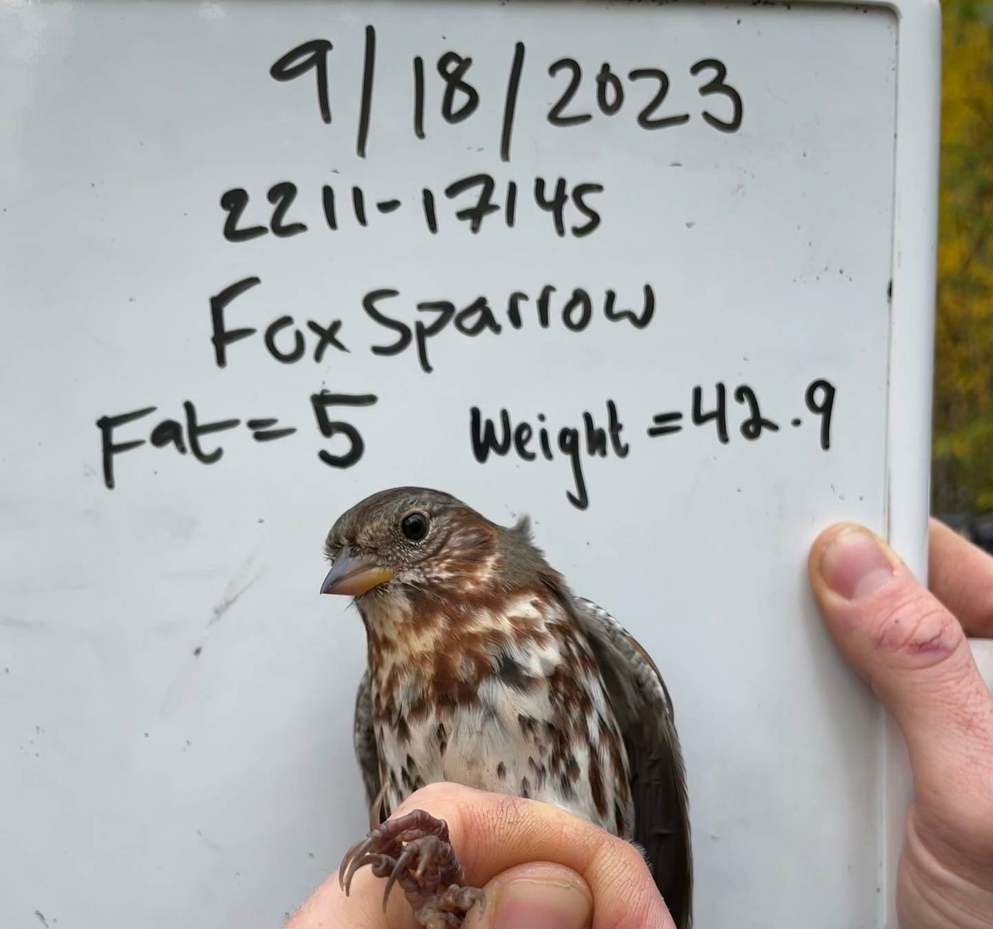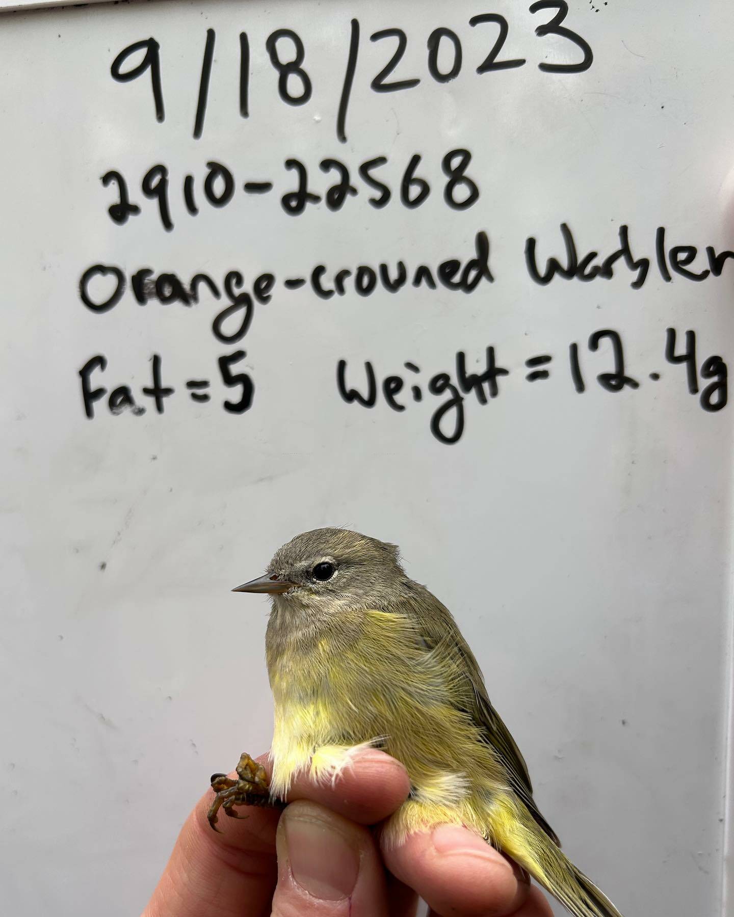 During the last few weeks, Snowden and his bird-capturing partners have featured slate-colored juncos (described as “chunkos”) who were among the heaviest they have ever captured at the station. Also featured were a few orange-crowned warblers “bulging with fat” and a fox sparrow so bulked up it was one of the heaviest ever recorded at the station. (With heavy being a relative term as it weighed about as much as three empty soda cans).