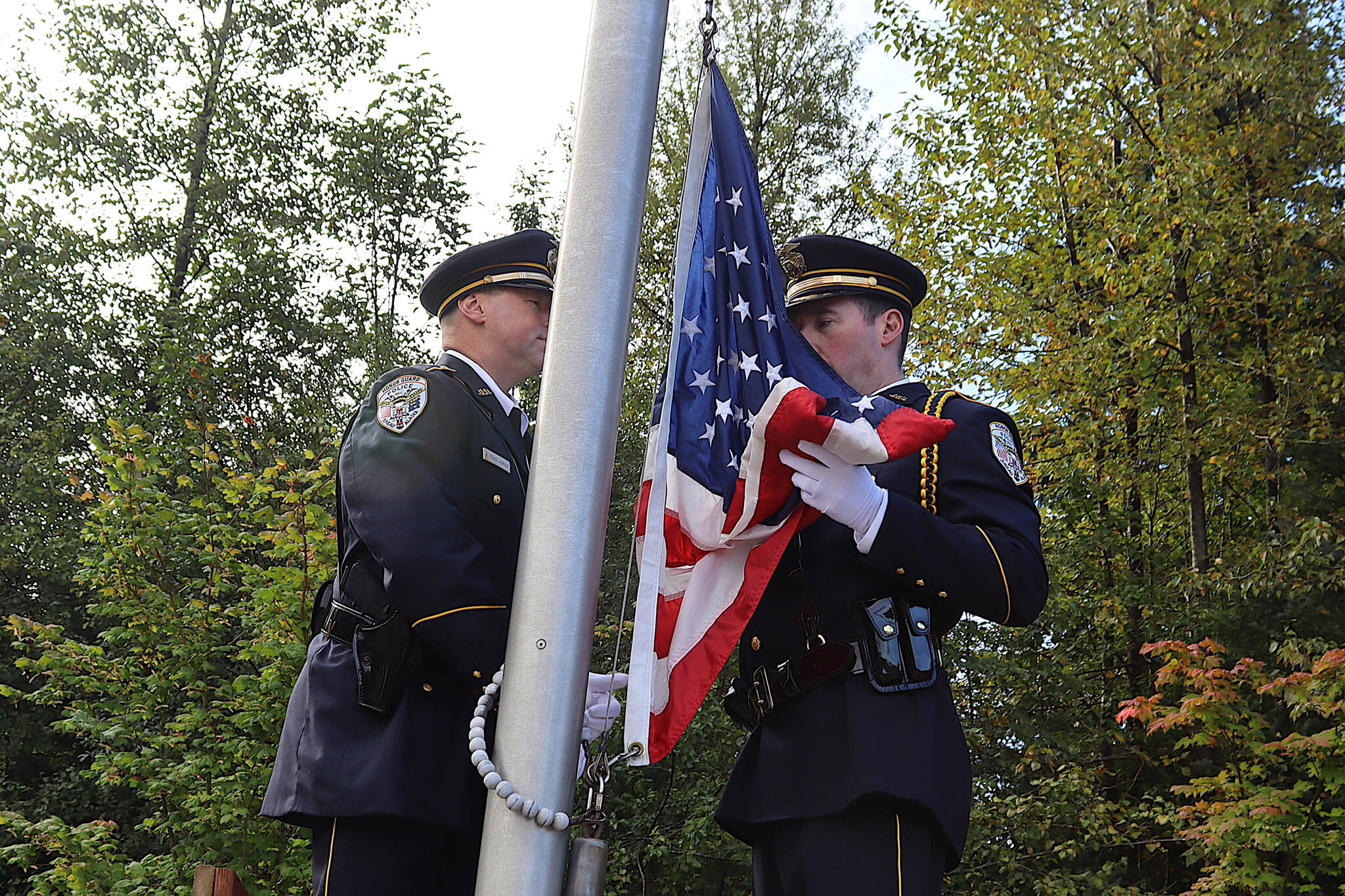 The ceremony featured other traditions including an opportunity for a procession of attendees to thank the emergency responders lined along three sides of the memorial, and a presentation of the memorial’s history and meaning by Juneau Police Department Officer Ron Shriver. At 9:58 a.m. — the same time on the East Coast the first of the Twin Towers collapsed on 9/11 — a raising of the memorial’s flag to half-mast was performed by JPD Detective Kirt Stage-Harvey and Officer Aron Landry while Kelsi Sell sang the national anthem.