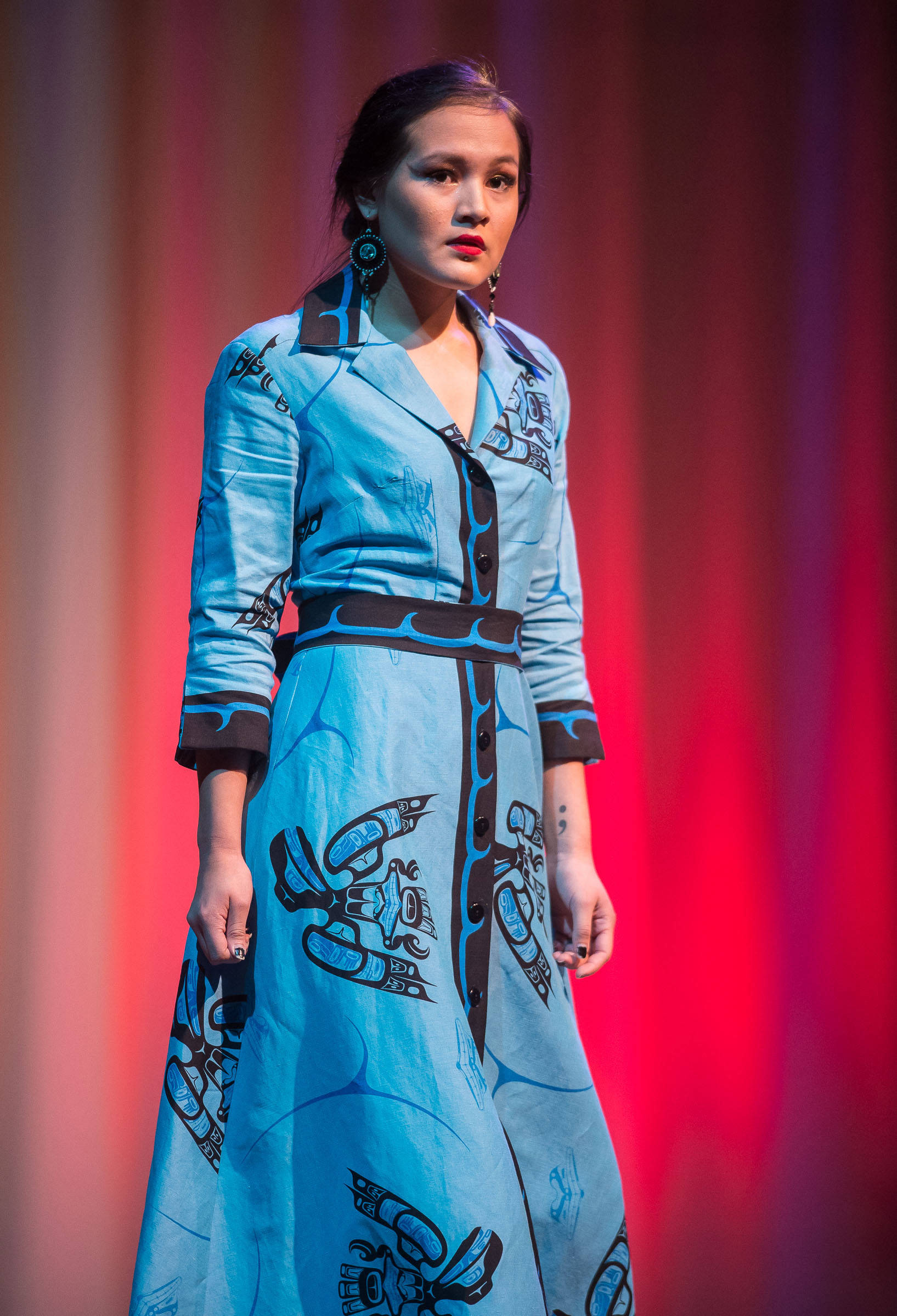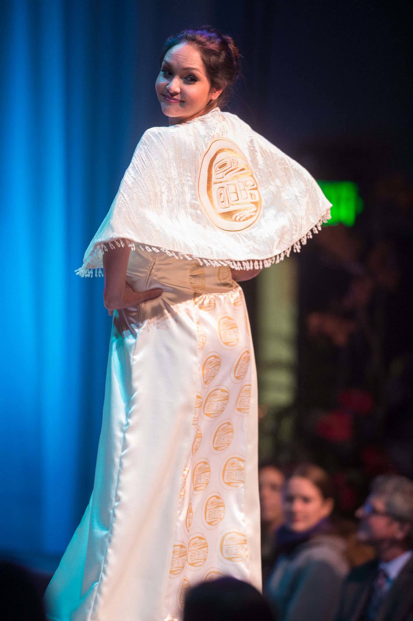Most notably, it began with an hour-long Native fashion show, directed by Amber-Dawn Bear Robe, of the Siksika (Blackfoot) Nation in Alberta, Canada. It featured 40 looks by 11 designers from Juneau, Anchorage, Washington, New Mexico and British Columbia, including Violet Dawn Ahmie, Pamela Baker, Barbara Fujimoto, Marcus Gho, Dorothy Grant, Louise Kadinger, Sandra Marion, Patricia Michaels, Rochelle Smallwood, Maria Shaa Tláa Williams and Crystal Worl. Local talent of various shapes and sizes modeled couture inspired by — and in many cases incorporating — Northwest Coast textile and formline art, capped by a special appearance from Alyssa London, Miss Alaska USA 2017, in a gown by Joey Galon Atelier with a design by Preston Singletary.