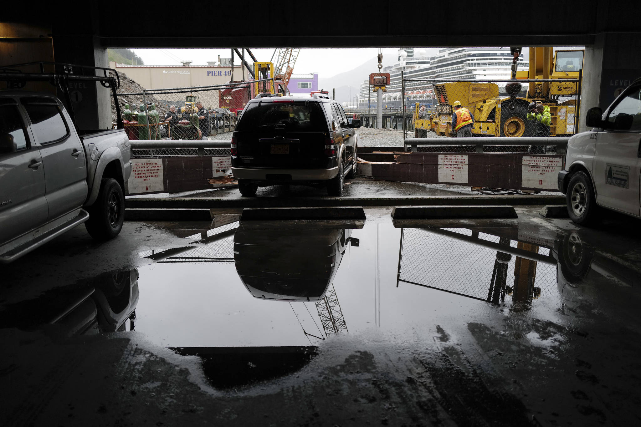 A construction worker with Trucano Construction Corporation was injured at a work site in downtown Juneau Monday afternoon after someone drove through a barrier at the downtown public library parking garage, authorities say.