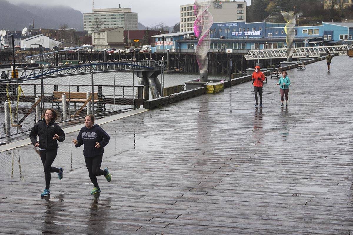 Runners jogged through rain and wind from the Hurff A. Saunders Federal Building, down the cruise ship piers and turning around halfway at Mount Roberts Road.