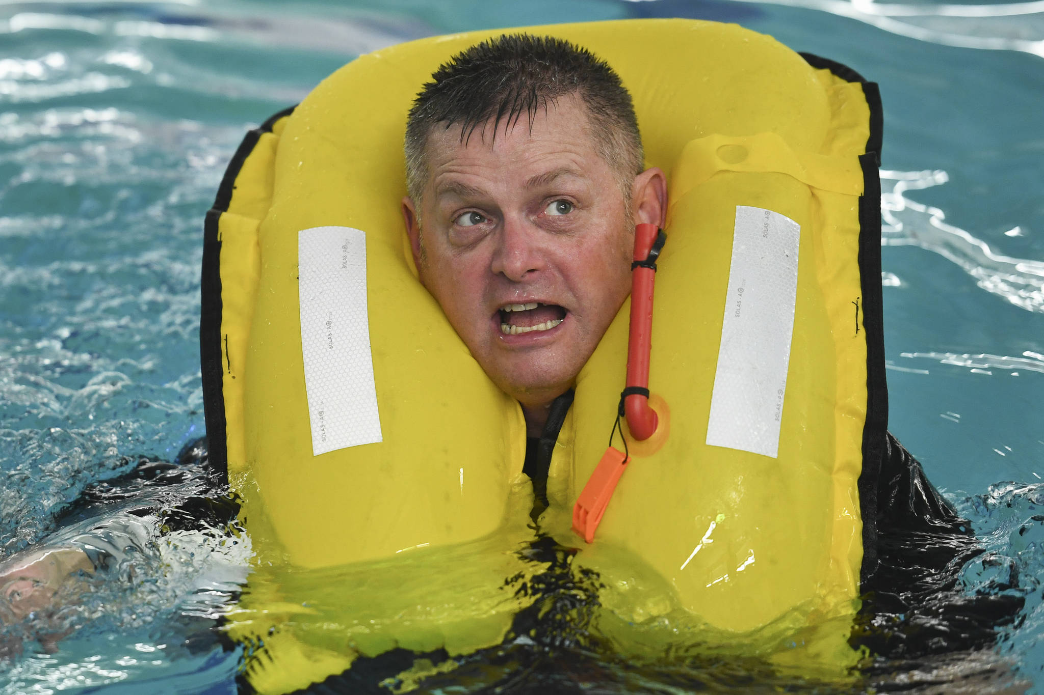 “99 percent of the time, we’re wearing a life jacket, we are dry, and we don’t feel the buoyancy,” said Annie Grenier, an instructor with Alaska’s Office of Boating Safety, who teaches the Coast Guardsmen how best to instruct schoolchildren in water safety, during a period of instruction.