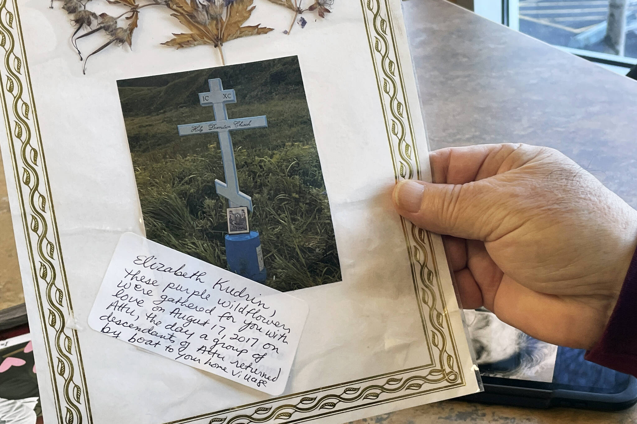 George Kudrin holds a photo of his wife’s grave, Dec. 1, 2023, in Anchorage, Alaska, with flowers gathered on Attu Island pressed inside the laminate cover. His wife was the second to last living descendant of Attu, Alaska, whose entire population was captured by the Japanese during World War II and sent to Japan until being liberated after the war. She died in February 2023, and her brother Gregory Golodoff, the last living Attu resident, died nine months after she did. (AP Photo/Mark Thiessen)