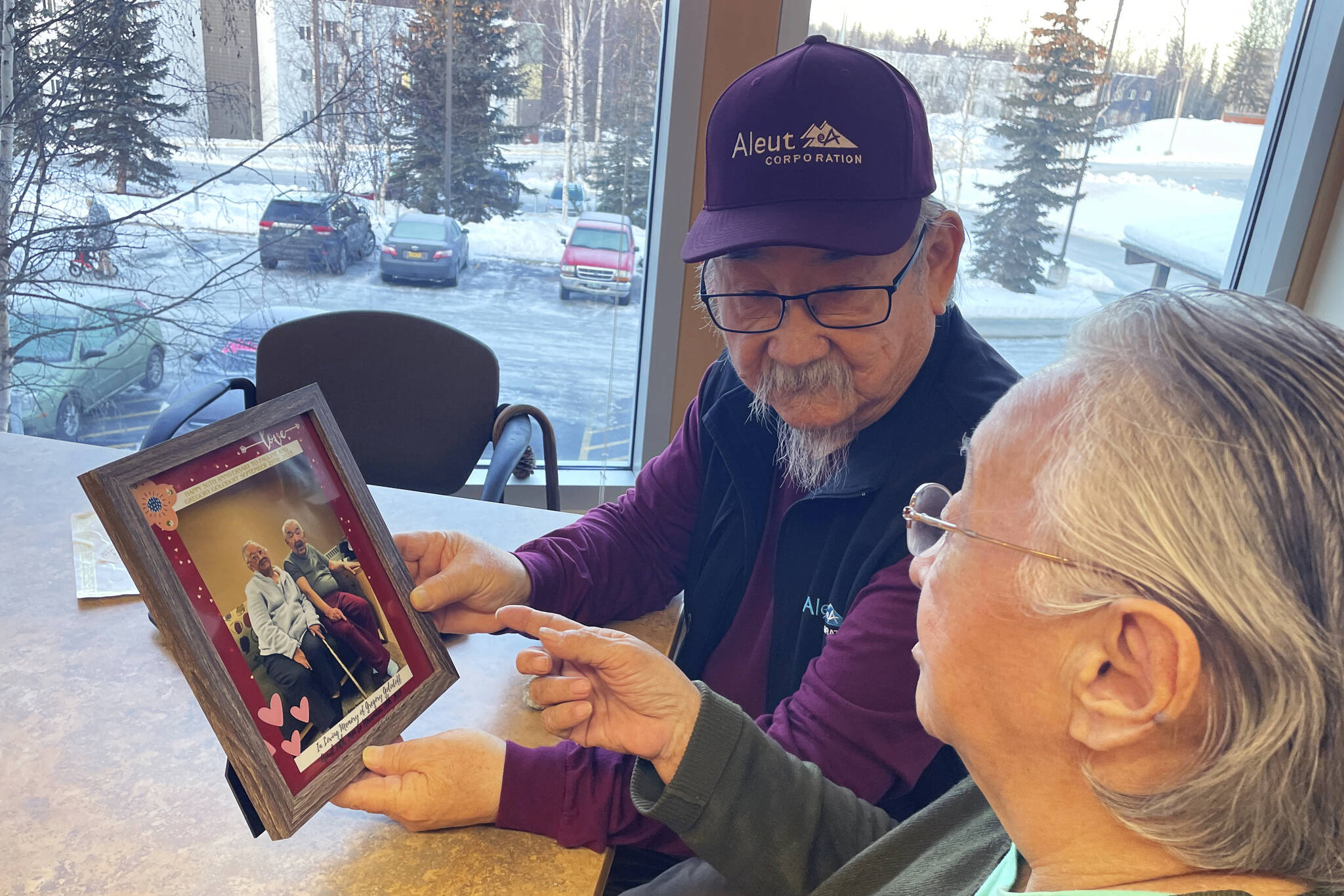 George Kudrin, left, and Pauline Golodoff hold a photo of Pauline and her late husband, Gregory Golodoff, Friday, Dec. 1, 2023, in Anchorage, Alaska. Gregory and his sister Elizabeth Golodoff Kudrin, George’s late wife, were the last two living residents of Attu, Alaska, whose entire population was captured by the Japanese during World War II and sent to Japan until being liberated after the war. The community of Attu was not rebuilt, and residents were resettled elsewhere, mostly in Atka, Alaska. (AP Photo/Mark Thiessen)