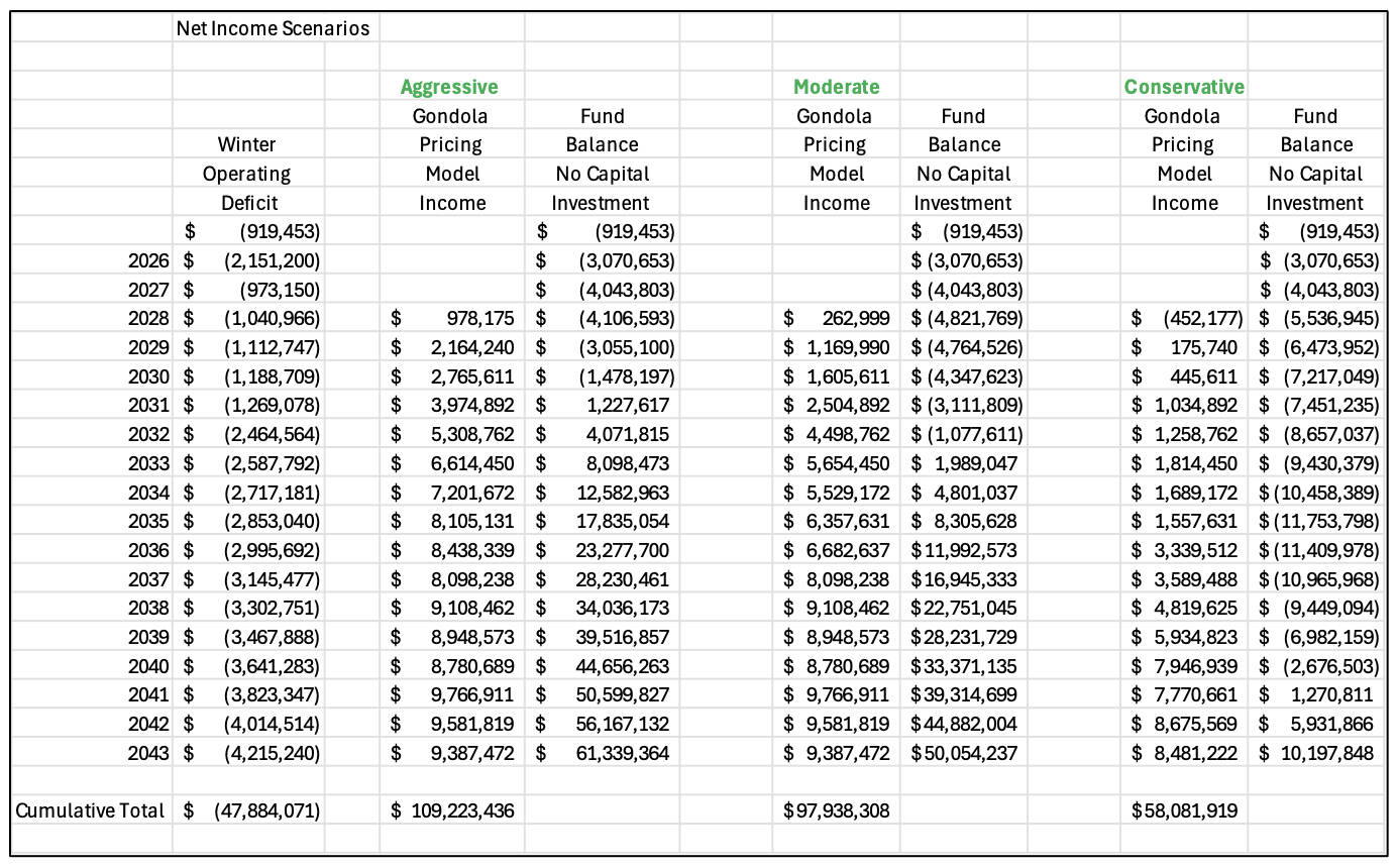Duncan said the $65 and $45 gondola ticket scenarios are meant to show outcomes if the $85 ticket price is indeed deemed too high. His report assumes the same number of passengers will ride the gondola regardless of price, beginning with about 40,000 during the first summer in 2027 and rising gradually to 125,000 by 2034.