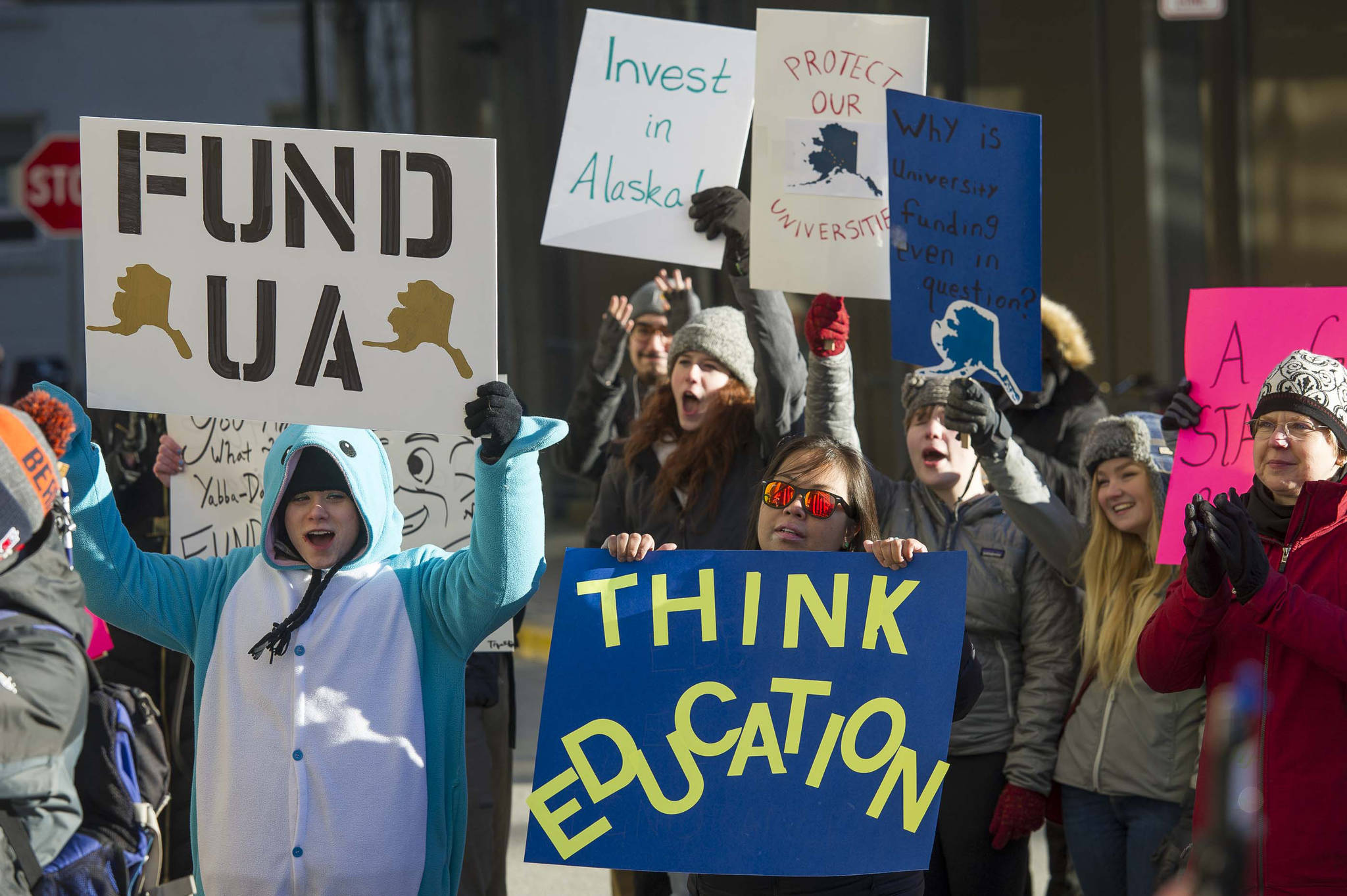 Students, faculty and other supporters of the University of Alaska system had to hold tightly to their signs during a rally Friday on the steps of the Alaska State Capitol.