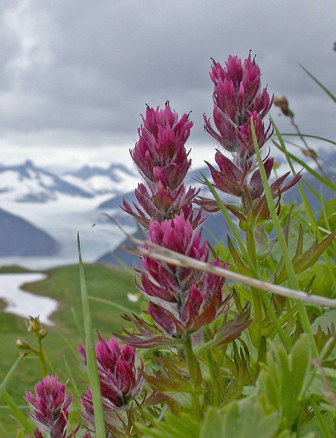 Late spring mingled with summer: little iris-like Tofieldia and leatherleaf saxifrage, with inflorescences of varied shades of red, were common; grass of Parnassus was about to bloom. Pink paintbrush prefers this habitat to the lower-elevation gravelly flats occupied by the yellow paintbrush species. The big treat was seeing dozens upon dozens of butterworts in bloom. Sometimes called ‘bog violets’ for a supposed resemblance to true violets, butterworts are not related to violets at all — although they both may have purple flowers. Butterworts are insectivorous, catching bugs on their flattened, sticky, yellowish leaves that are not a bit like violet leaves.