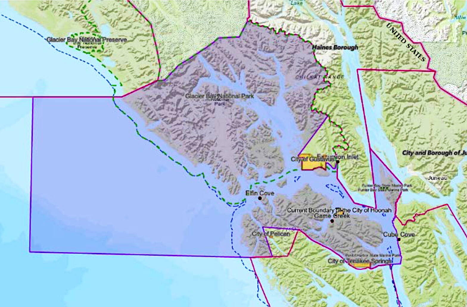 The petition by Hoonah city officials seeks to include natural areas including Glacier Bay and Chichagof Island — and small communities including Game Creek, Elfin Cove and Funter Bay — in the Xunaa Borough. It also notes the area includes “all of the Huna Tlingit’s historic territory” except for an area already incorporated into the Haines borough, and the proposed name is a closer match than Hoonah to the Tlingit language word for the community.