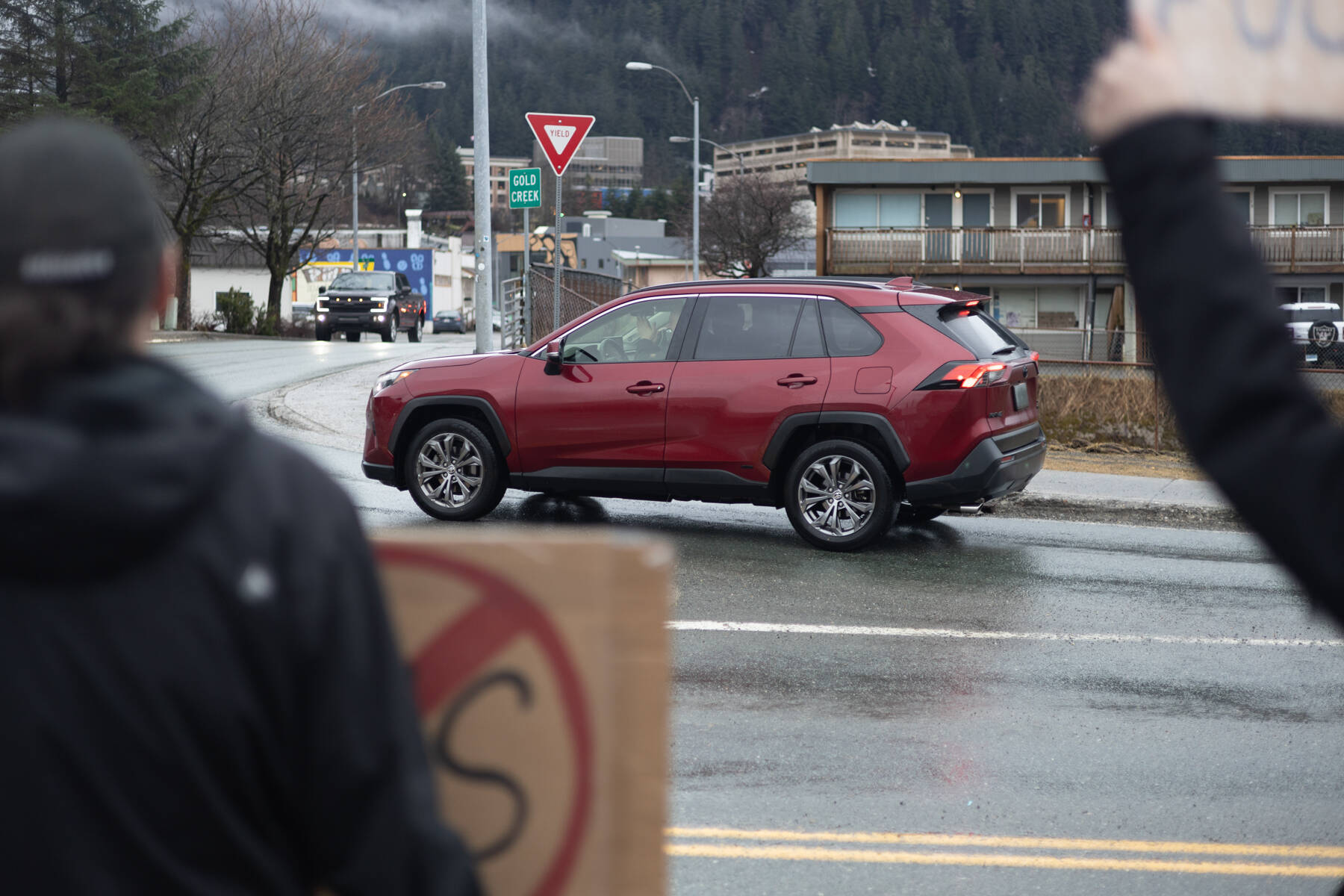 After the discussion, the group of 10 gathered at the corner of Glacier and Willoughby avenues with homemade signs. Drivers honked and waved as they passed.