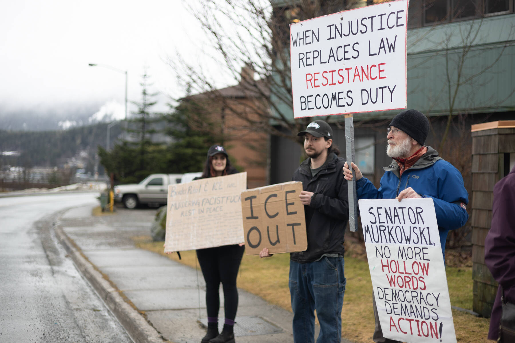 The local activist group Juneau for Democracy hosted a small pop-up street rally and discussion outside Senator Lisa Murkowski’s downtown office Wednesday afternoon to protest the Trump administration and encourage Senate staff to take a stand against Immigration and Customs Enforcement.