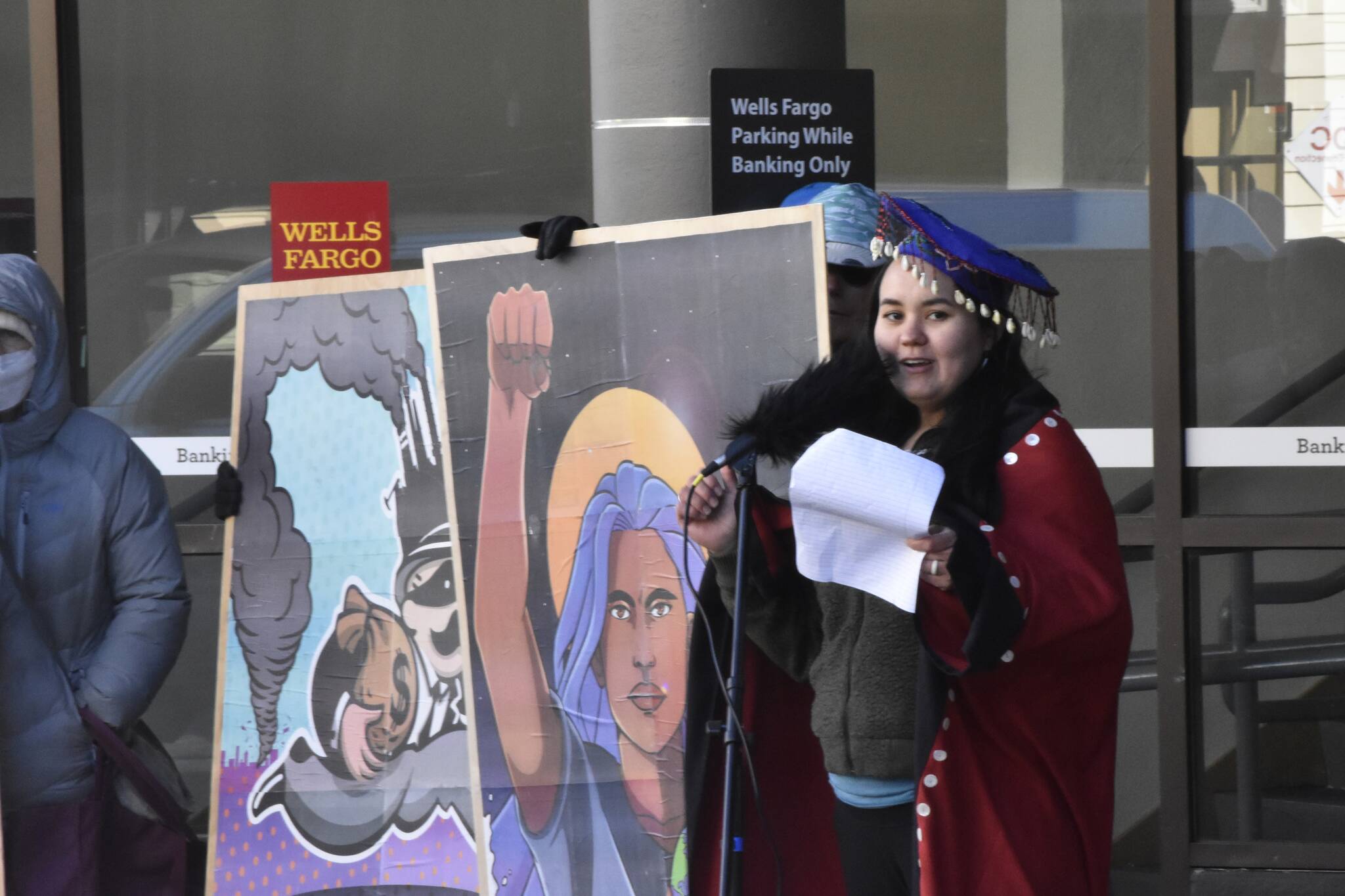 About 20 demonstrators gathered Monday in front of the downtown Juneau branch of Wells Fargo, to deliver a letter to the bank’s corporate leaders calling for an end to all funding of new fossil fuel developments.