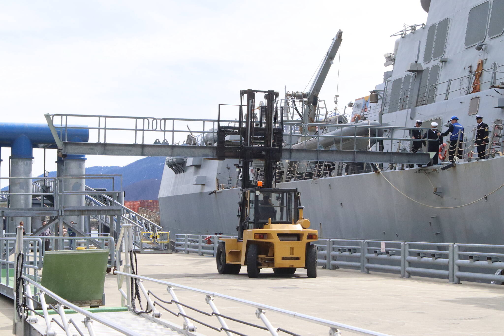 Multiple groups were aboard the ship at any given time Sunday morning, including two tours provided to state legislators in addition to those provided to a growing line of people at the dock’s terminal. A tour that included a few media members among other residents was led by Lt. Daniel Schuerman, the ship’s operations officer, who took the group to various exterior portions of the ship where various features — weapons most prominently among them — were explained.