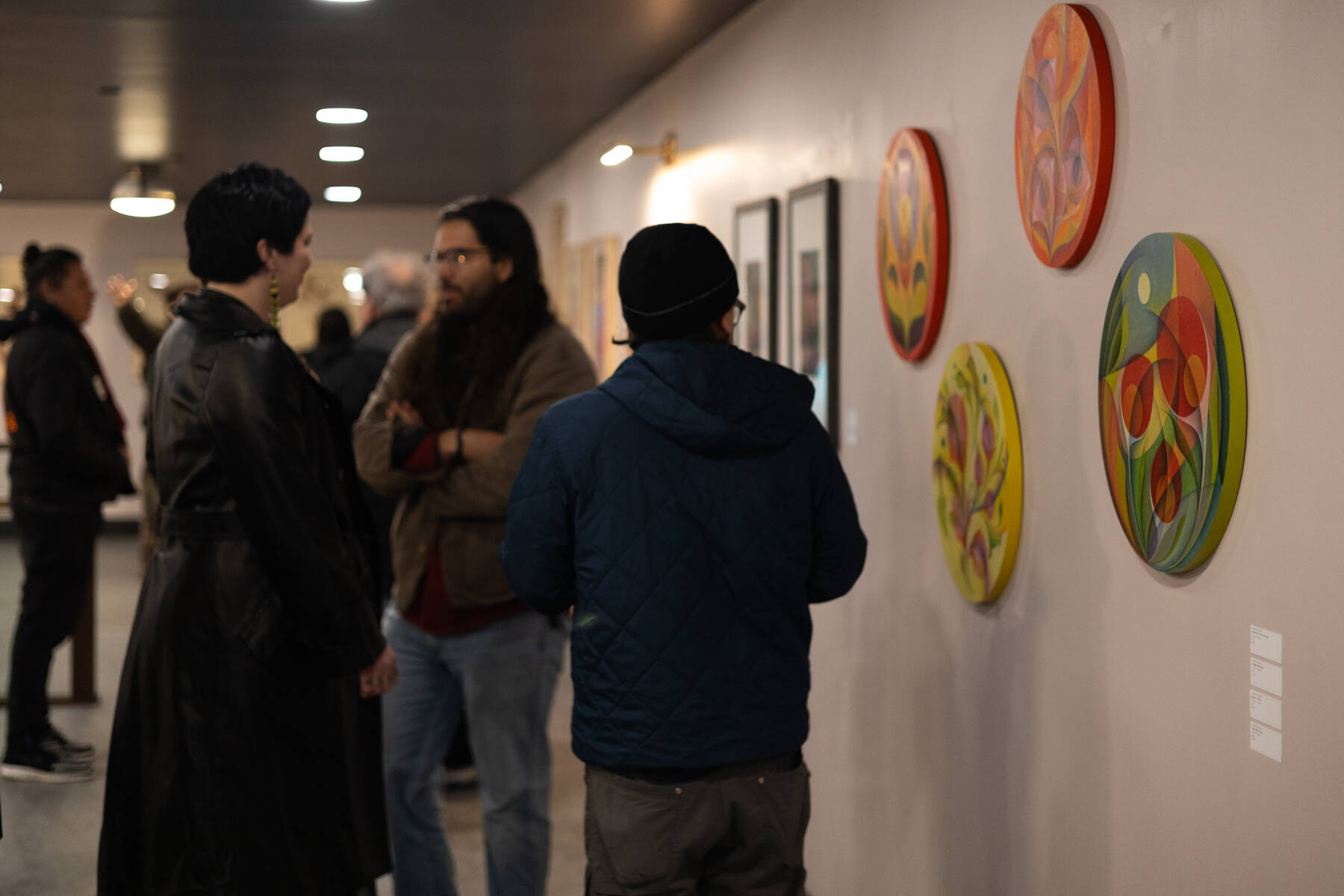 Dozens of people attended the opening of “Gestures of Our Rebel Bodies,” a group exhibition by seven Indigenous artists, at Aan Hít in downtown Juneau on Saturday, Jan. 24. Tlingit & Haida presented the exhibition in collaboration with the Institute of American Indian Arts and Sealaska Heritage Institute, and it will remain on display until June.