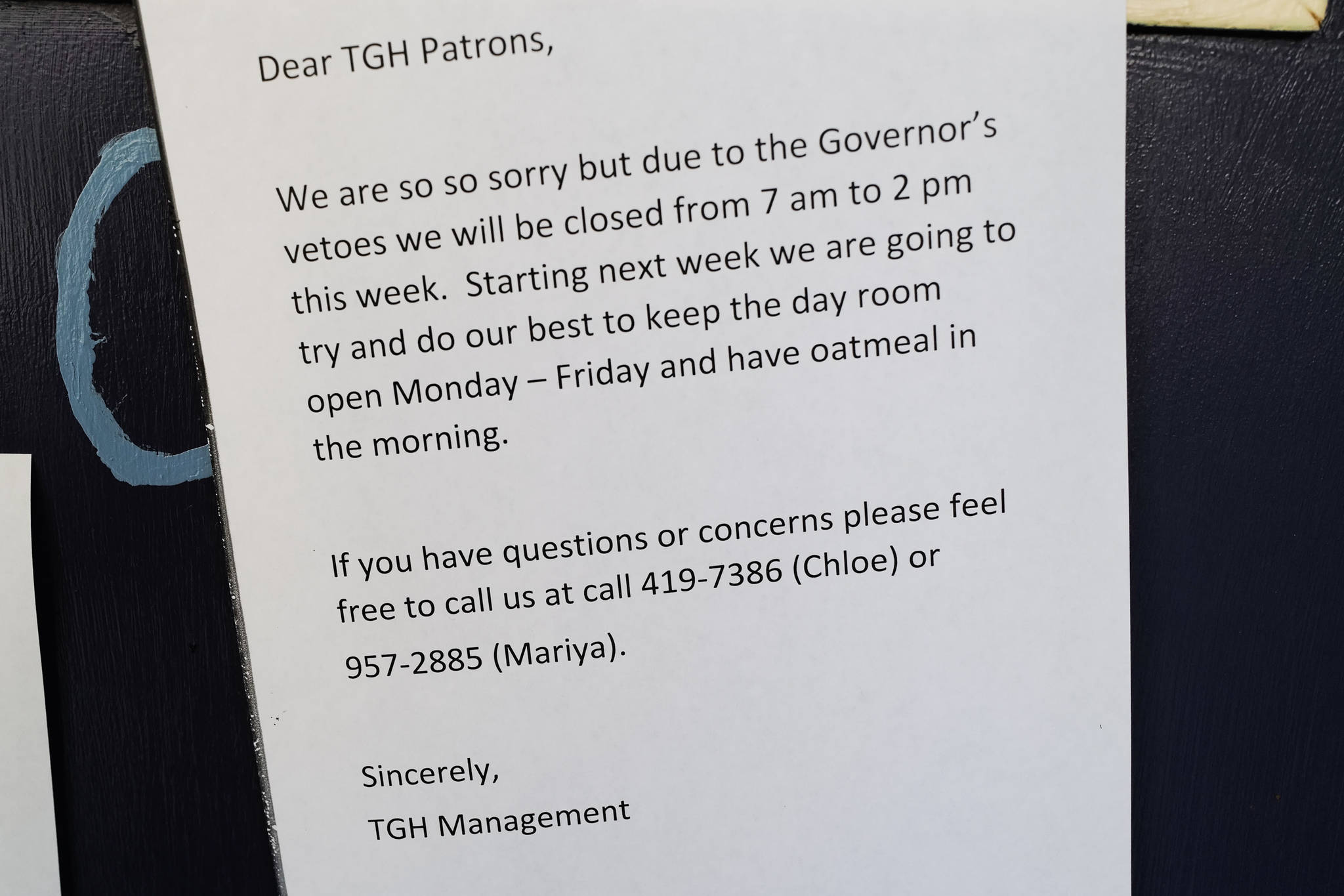 A sign on the front door of the Glory Hall announces its daily closure on Tuesday, Aug. 13, 2019. The emergency shelter and soup kitchen is closing its doors from 7 a.m. to 2 p.m. daily due to budget cuts forcing the homeless to find other places to be. (Michael Penn | Juneau Empire)