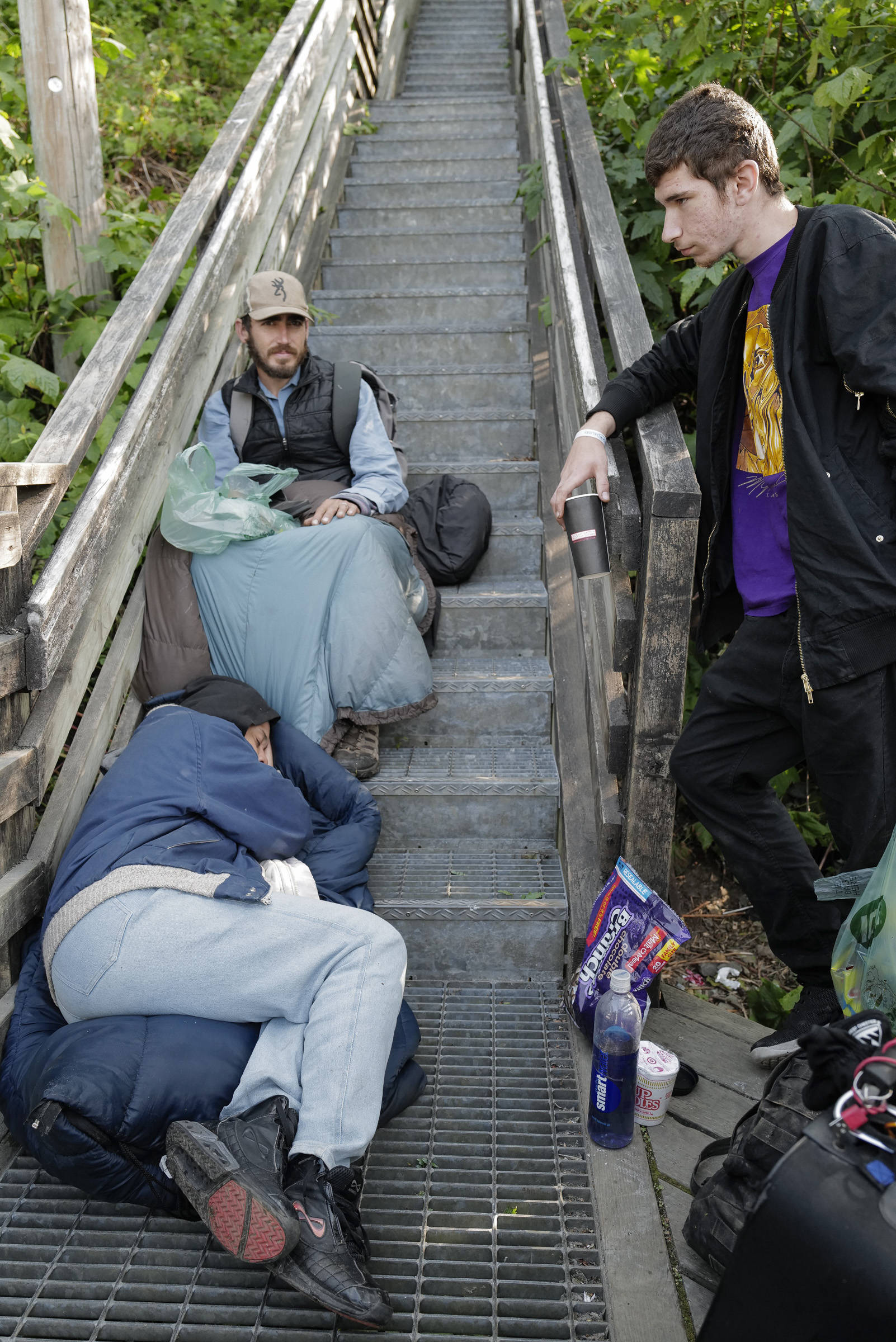 Homeless people spend their time on the Decker Way stairs after the Glory Hall’s closure on Tuesday, Aug. 13, 2019. (Michael Penn | Juneau Empire)